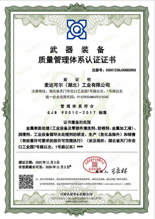 在麦达可尔服务商及客户尤其是军工客户的大力支持下,经过公司全体员工的共同努力, 麦达可尔于2023年11月顺利通过武器装备质量管理体系认证。